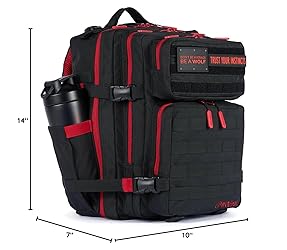 Versatile and Spacious: This 35L bag with a 17in x 12in compartment is an ideal travel backpack, military rucksack, or daily accessory. Waterproof and Durable: Made of Waterproof Oxford 1000D polyester, this MOLLE backpack is load-tested up to 35lbs, ensuring longevity. The YKK Japanese two-way, water-resistant zippers and 180-degree opening make this item a tactical backpack that's both reliable and easy to use. Express Your Personality: Customize this military tactical backpack with removable patches on the built-in Velcro space. Two patches with the messages "Trust Your Instincts" and "Be A Wolf" are included. On-the-Go Convenience: The WOLFpak travel backpack has two cup holders for carrying your water bottle or tumbler. The protective inside computer pouch (10in x 10in) provides a secure and padded space for your laptop or tablet, making this item a practical and convenient laptop backpack. Suitable for Anyone: As this item fits conveniently in the overhead compartment for easy storage, this backpack for men and women provides comfort for everyone.