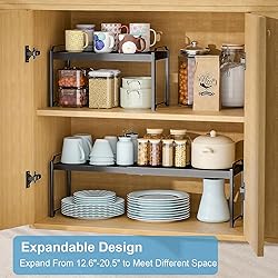 2 Pack Expandable Cabinet Countertop Shelves, Stackable Shelves Organizers For Kitchen Cabinet Countertop Storage, Adjustable Counter Cupboard Pantry Organizer Shelf Rack Stand, Length:20.5"
