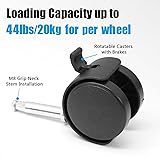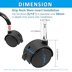 Package Included: 4 x 2 inch diameter caster wheels with brake. 8mm (6/15 inch) x 38mm (1-1/2 inch) grip neck mounting stem. Insert-into installation for hole 8mm in diameter and 38mm in depth. Casters diameter: 2"/50mm, width: 1.38"/35mm, height: 2.16"/55mm. Heavy Duty: Constructed with high-strength nylon wheels and thickened cold rolled steel caster grip neck stem, the caster wheels are rustproof, rigid and wear resistant. Smooth Rotation: Lightweight plastic caster wheels are flexible to move quietly and smoothly and prevents from scratching. Easy to Install: Features with large bearing load capacity, 20kg/44lbs for per wheels, the small swivel stem caster wheels are 360 degree rotatory and stable installed by finding the sweet spot and inserting-into the hole. Wide Application: Perfect stem caster wheels replacement for furniture, racks and small appliance, shelves, drawer, cabinet, table, desk, stand and etc.