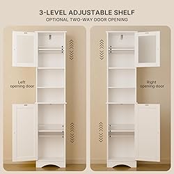 Two Adjustable Shelves: The cabinet featuring two doors and four compartments. The removable or height-adjustable baffles enable personalized storage for daily necessities like roll paper, towels, shower gel, and laundry detergent Stable and Secure: This practical storage cabinet features a waterproof finish for easy cleaning. The whole frame is made of FSC-certified wood. Magnetic catches ensure smooth opening and closing, while an anti-tipping device enhances stability and safety. Tall Linen Tower Design: This storage rack optimizes your space while maintaining a compact footprint. Its elegant white finish embodies mid-century modern style, and the frosted glass cabinet door allows you to easily view the items inside Multifunctional Scene Space: This versatile cabinet serves as a bathroom storage for toiletries, a kitchen organizer for spices and tableware, or a bookcase in a study, helping you maintain a tidy living space Easy Assembly and Good Service: The simple structure, numbered parts, and clear instructions will help you assemble this product. If you have any questions during use, please come to us and we will provide you with answers within 24 hours