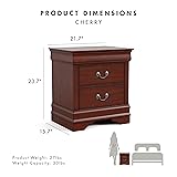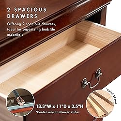 🕰️STURDY SOLID WOOD: Cherry nightstand crafted with solid wood legs and framework, offering durability and reliable support. Veneer surface crafted from engineered wood for resistance to cracking. ⏳TIMELESS DESIGN: Traditional-inspired aesthetic with moulded trim details and elegant bracket-style feet. Seamlessly blends classic and modern styles, enhancing the sophistication of bedroom decor and evoking the charm of antique furniture. 🛌REFINED ACCESSIBILITY: This bedroom storage essential is equipped with two drawers on metal glides and antique-style handles. The tabletop provides space for lamps, decor, and personal items, ensuring your supplies stay organized. 📜VERSATILE USAGE: Available in black, cherry, and white, this piece of furniture for bedroom complements various spaces and styles. Offering convenient storage for diverse needs, it's perfect for the bedroom, living room, dorm, and guest room. 🔧FULLY ASSEMBLED & CARE: Arrives fully assembled, and ready to use. Enjoy a one-year warranty for peace of mind. Easy to clean bedroom nightstand with a quick dust or a dry cloth, ensuring easy maintenance.