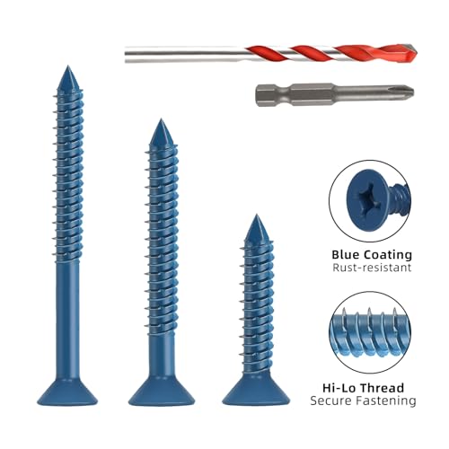 - Performance: The Concrete Screws are hardened to a high temperature for exceptional hardness, anti-rust property and corrosion resistance; The high-low thread design provides strong fixing ability, and the sharp tail makes drilling faster.