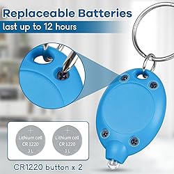 Ultra Bright LED Flashlight: The flashlights provide a brightness of 12 Lumens. The bright white light could light up to 33 feet. Perfectly meets your multiple lighting needs. Light and Portable: Each keychain flashlight is equipped with a 1-inch key ring, which makes it easy to attach it to your keychain and other places. Each item only weights 0.2 oz. It can add no extra burden to your keychain. Replaceable Batteries: Each keychain flashlight contains 2 CR1022 button batteries, which provide up to 12 hours of continuous use. The batteries can be easily removed and replaced when they run out. Easy Lighting Method: Slide the ON/OFF switch, the light would be constantly on. Simple operation allows you to easily use it in all kinds of activities. Wide Application: Comes with 7 pcs keychain flashlights. It is a perfect tool for outdoor activities like camping, hiking, repairing and so on. It's also a good choice for Christmas presents.