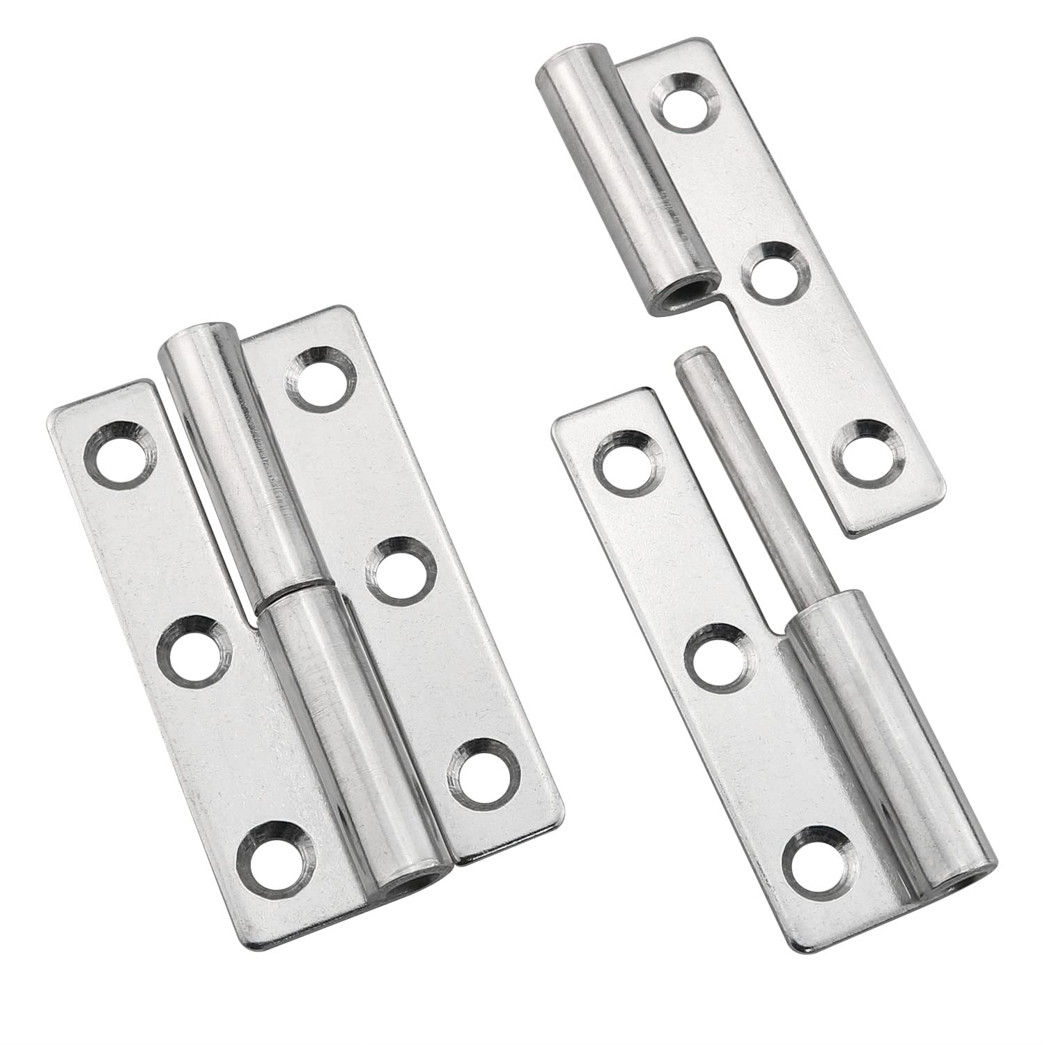 - Material: Stainless steel Color: as shown in the picture Size: as shown in the picture Package contains: 2x hinges 8x screws Notice: Due to manual measurement, slight errors in size are allowed. Due to different screens, there may be slight differences in color.