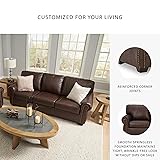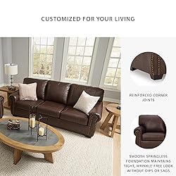 TRADITIONAL SOFA: Sporting classic elements including a roll arm frame with nailhead trim, this couch provides here-and-now relevance. But you’ll love the look for years to come QUALITY MADE: Built with a sturdy corner-blocked frame. Back cushions are attached; seat cushions are loose. Exposed feet with faux wood finish AFFORDABLE LUXURY: Genuine leather covers inside areas such as the back, seat & arm cushions; matched faux leather covers the remaining areas COMFY SEATING: Measures 92" W x 40" D x 39" H. Seat height: 20". Seat depth: 22". Arm height: 26". Distance between arms: 72”. This furniture is perfect for curling up and reading or dozing ARRIVES ASSEMBLED: Ready for instant enjoyment in the living room or family room. Fits through doorways 36” or wider. Set it with a recliner, accent chair or loveseat to complete your space