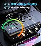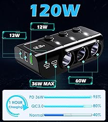 5 USB Fast Charging Ports (Total 60W Output): This multi-port car charger includes 2 Type C PD ports, 1 QC3.0 port, and 2 USB-A ports, supporting a total output of 60W. Built-in intelligent chips automatically detect the optimal current for each charging device, providing fast and safe charging for iPhone, Samsung, Motorola, LG, tablets, and more. Perfect for family road trips with multiple gadgets. High-Power 120W Cigarette Lighter Splitter (3 Sockets): Expand your vehicle’s single cigarette lighter socket into 3 12V/24V outlets. Each port delivers stable and clean power (up to 60W total), ideal for powering tire inflators, air purifiers, dash cams, GPS units, vacuum cleaners, car refrigerators, heated seats, and other car accessories. Ideal for camping, off-roading, and long drives where you need full device functionality. Stable, clean power output protects your car and devices from voltage fluctuations. Independent Power Switch: Each lighter socket includes a separate On/Off button for safety, making it handy to prevent repeated plugging and unplugging while also conserving energy and protecting the equipment. There is also a master switch that can control all outlets. LED Voltage Display: The cigarette lighter splitter's real-time LED voltmeter display aids in keeping track of the battery voltage in your automobile. Protect against over-voltage, over-loading, over-heating, short-circuiting, over-current, and over-charging. Specifically marketed road trip essentials, and offers the highest power output to keep your entire family's devices charged during long journeys. Wide Compatibility& Easy Installation: Equipped with A 3.3-foot power cord to assist you in powering the backseat passengers' entertainment. Everyone has access to the electricity they require without having to take a different gadget out of the charger. Fit for the majority of vehicle types, including off-road, RV, SUV, truck, MPV, and CDV automobiles.