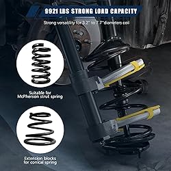 【Safety Comes First】 spring compressor equipped with a spindle overload protection device, which means that it allows operation with an impact wrench. When the main shaft is overloaded, the protection device will break in advance to play a full warning role.The safety tongues prevent the springs from detaching, while the protective sleeves protect against scratches. 【Great Compatibility】 Our strut spring compressor has 9921 lbs/4500 kg load capacity and is perfect for motorcycles, cars, SUVs, and more. The strut spring compressor kit is designed for shock absorber spring removal, including MacPherson strut and conical springs. 【Easy to Operate】 Just select 2 spring yokes that match the corresponding springs, fix them on the basic tensioner with the provided screws, and then use a wrench, ratchet or impact wrench to turn the lead screw until the spring is fully tensioned. Remember to lubricate threads. 【Superior Material】Crafted from #45 steel, our fork strut coil extractor tool undergoes heat treatment for superior hardness. The threaded rod's resilience handles extreme pressures, and the yokes are fortified to withstand fractures and bending. 【3 Interchangeable Yokes】 With three yoke options, our spring strut compressor fits various vehicle models: Gold: 2.6-4.9 inch spring holder (compression range: 2.6-11.8 inches); Black: 3.4-6.3 inch spring holder (compression range: 3.3-12.8 inches); Silver: 4.9-8.3 inch spring holder (compression range: 3-12.6 inches).