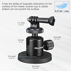- Magnet Camera Mount for GoPro with 360°Rotation Ball Head & Action Camera AdapterThis magnetic mounting base kit includes a magnetic mounting base, a mini ball head and a tripod mount adapter/thumbscrew for action cameras. Allows to mount your action camera, small camera, camcorder or monitor on a car, boat, indoor or outdoor.Non-scratch Rubber CoatingThe magnets on this mounting base are covered with rubber coating, so it won't damage or scratch the mounting surface, also protect your devices from slipping and shiftingSUPER STRONG MAGNETISMThis magnetic mounting base features strong magnet with compact 66mm / 2.6" diameter and uses neodymium magnet to achieve a strong, non-slip vertical resistance up to 26 lb (12 kg) when mounted on a flat metal surface (steel or iron surface, not for aluminum surface). It is not recommended to support products over 1.1lbs/0.5kg in sports scenes. The mini ball head also supports up to 11 lb (5 kg).Wide CompatibilityBoth the magnetic mount and mini ball head have an industry-standard 1/4"-20 mounting screw on top for use with action cameras, video security cameras, surveillance cameras, small cameras & camcorders, LED lights and more devices with a 1/4"-20 thread.360° Rotatable & 90° Tiltable Mini Ball HeadThe mini ball head is 360° rotatable and the rotary angle is controlled by the rotary knob. The ball platform also 90° tiltable. This mini ball head can meet the needs of different shooting angles.Compatible with a variety of photographic equipment and usage scenariosPacking List:1 * magnetic base1 * 1/4" ball head1 * action camera adapter* The weight capacity varies depending on the type of mounting surface. Always test the mount's ability to securely hold your device before use.