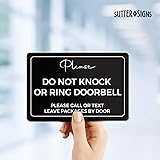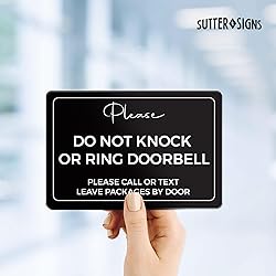 - Create a peaceful environment in your home or office with our 'Please Do Not Knock or Ring Doorbell' sign. In today’s world, where work-from-home and the need for quiet have become more prevalent, this sign serves as a courteous request to visitors, delivery personnel, and friends to respect your space and silence. Designed with both functionality and aesthetics in mind, this sign combines clear communication with a sleek design. Crafted from high-quality ABS plastic, our sign is built to last. It’s resistant to weather, ensuring the message remains clear and visible no matter the season. Installation is a breeze thanks to the full adhesive backing; simply peel and stick to any clean, smooth surface for an instant setup without the need for drills or nails. At 4"x6", this sign is the perfect size to catch the eye of anyone approaching your door without being obtrusive. The stark contrast of white text on a black background ensures the sign is easy to read, conveying your message effectively from a respectful distance. Whether you have a baby sleeping, are on important calls, or simply cherish your quiet time, this sign helps safeguard your peace. This 'Please Do Not Knock or Ring Doorbell' sign is not just a practical tool; it’s a reflection of your consideration for your household’s tranquility and your professional engagements. It’s an indispensable item for anyone looking to minimize disturbances in their personal or work life. Invest in tranquility and focus today with our elegantly designed, easy-to-install 'Do Not Knock or Ring' sign, and enjoy the uninterrupted calm it brings to your doorstep.