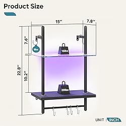 - Bestier industrial floating shelves are designed to bring a sense of relaxation and comfort to your space. These LED pipe shelves, perfect for your kitchen, living room, gaming room, or bedroom, feature 20 colors and 22 modes, turning your wall into a visual party. The 15 inch kitchen wall shelves are not only large but also come with glass shelves, 6 S-hooks, and a towel bar, providing ample space for your kitchen and bathroom accessories, bedroom, gaming devices, electronics, books, magazines, plants, and more. Please note: Be sure to read the assembly instructions carefully before beginning. If you encounter any issues, don’t hesitate to reach out to us for assistance.
