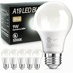 - LED Light Bulbs Daylight 5000K, 60 Watt Equivalent LED Bulb, 9W Bright White Light Bulb, A19 E26 Standard Base, Non Dimmable, Energy Saving, 800LM, 120V, UL Listed, 15000 Hour Lifetime, 6 Pack