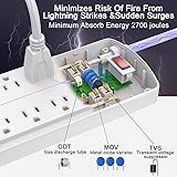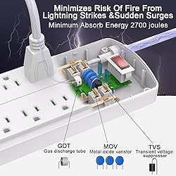 【Multi Function Power Strip】: Power Strip Surge Protector with 12AC outlets & 4 USB charging ports (5V/3.4A,17W), 6-feet Heavy Duty power extension cord(1875W/15A), surge protector (2700 Joules) with overload protection protects against spikes and fluctuations. Wide range voltage design, can be used on 120v to 240v circuit. 【Surge Protector Power Strip with USB】: 2 Special design widely spacing AC outlets (2 inches) for large adapters with 10 standard spacing outlets,4 USB ports(1 USB C) Total 3.4 A/17W, Each USB A port features 2.4A Max output. USB C charging port features 3A MAX. Built-in smart technology, detecting charging devices and deliver optimal charging speed automatically, compatible with Kindle and most USB devices. 【Surge Protector Outlets】: The 3 level complementary Surge Protector Circuit which composed of TVS (transient voltage suppressor),MOV (metal oxide varistor), GDT (gas discharge tube), with minimum 2700 Joules energy absorbing capacity, could protect your devices much more quickly and reliably than other brand's 1 level MOV Surge Protection Circuits. 【Safety and Certificate】: ETL safety certified,with extension cord and other major components certified by ETL. The over current protection switch limits the power strip's working current to certain setting, so it will not get hot during usage. Environmental protection and fire-resistance PC shell with flame retardant at 1382℉ makes it more durable and longer lifetime. 【Our Services】: Alestor Power strip, Maunal,30-day return, our worry-free 12-month, and reliable customer service will respond to you within 24 hours.