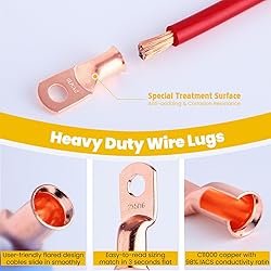 - 【What You Get:】 132 Pcs of AWG 8 6 4 2 1/0 2/0 Heavy Duty Copper Wire Lugs ring terminals, copper lugs closed end termination ring terminals with 132 Pcs 3:1 Dual Wall Adhesive Heat Shrink Tubing Tube for your work. 【Quality Material:】 The TKDMR bare copper battery cable ends are made from 100% annealed copper with special treatment surface for corrosion protection, providing a high degree of conductivity for maximum current flow. Can be Crimped or Soldered.The 3:1 shrink tube is well made of high quality material(UL & CSA certified for up to 600V,257℉), thick and durable than 2:1 shrink tube. 【Reliable and Easy to Use:】These battery lugs with heavy duty construction,improves high temperature durability and have a close end pad design, keeping electrical components, batteries and cables safe and free from moisture, and also prevents solder from leaking during installation; high standard flared opening for easy wire insertion.The wire shrink wraps are all pre-cut into the most common sizes which improve your work efficiency. 【Wide Applications:】These Copper Lugs works with Heat Shrink Tubing which are safe and reliable , greating for distribution box, golf carts, solar panels, marine,home applications,Vehicle,Motorcycle,DIY Electrical Wirings and Other Outdoor Applications.