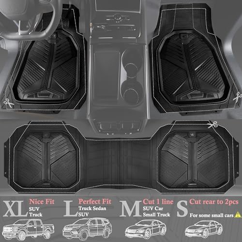 - Trimmable & Universal Fit: There are cuttable lines on the sides of mats, which can be modified according to your vehicle size for a perfect fit. Fast and easy to install in most cars, trucks and SUVs. Thick, heavy duty mats & Liners. Flexible for floor contours and tough for all weather conditions.