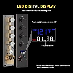 【4 Function Shower System】Ceiling mount shower system includes rainfall waterfall shower head, 4 shower body jets, a hand shower , each function is controlled by a knob, so all functions can work simultaneously or individually 【Luxury Shower System with LED Temperature Display】——Show you the temperature of the water and time of use, which can help you to find the most comfortable water temperature and Control your bath time. No electricity no battery, powered by water flow, you can open one function at one time 【Pressure Balance Shower Mixer Valve】——The digital shower system with copper pressure balanced valve, standard U.S. Effectively Improves durability of the Rough-in valve with cUPC Certification. Ensures quality, longevity, keeps it constant without fluctuations to prevent scalding SPA EXPERIENCE -- body jets combination, horizontal spray massaging head, adjustable spray face. Up, down, left, right rotation direction. 【5 Years Warranty】Major parts are brass and come in individual packaging with blister protection inside, installation instructions are included. If you have any questions about our products, please feel free to contact us via email or any feedback, we will reply within 12 hours at the earliest!! ✔ Try it and you will love it