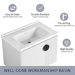 - Our vanity sets are made from sturdy hardwood plywood,enduring more pressure and usage than MDF or particle board units.Spacious storage and soft-close doors offer both convenience and elegance. Quick-install wall-hung cabinet with removable sink top fits any plumbing.Ceramic basin,fired at 1280°C and glazed three times, ensures a smooth,easy-to-clean surface.A perfect blend of durability and style for your bathroom. ⚠Package not include: Faucet,Pop-up Drain, Drain Assembly, P-Trap, Back-splash and Mounting Bracket are not included⚠Notice:Due to screen differences, the actual color may vary slightly from what appears on your monitor or phone. Contact us for a color sample if you need help selecting a finish♥Care、Cleaning and Maintenance ♥1. Dust regularly with a soft , dry cloth2. Avoid the use of all chemicals , household cleaners , abrasives,or cleaners that contain lemon,vinegar,or other acids that may damage the finish3. Excessive exposure to sunlight and extreme changes in temperature and moisture can damage wood furniture4. The sink is resilient,but care needs to be taken to preserve its appearance5. Do not place hot appliances,such as curling irons and hot hair dryers directly on the countertop.Wipe spills immediately