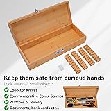 KEEP YOUR KNIVES ORGANIZED AND SAFE: Keep sharp knives safely organized. Never worry about your kids coming into contact with dangerous knives again. Safely store all kinds of steak knives, fruit knives . Vegetable knives . Scissors and other items. Comes with a combination lock while you still have easy access to it yourself FIT VARIOUS KNIFE SIZES / PRACTICAL DRAWER SPACE SAVING: This knife box is more secure and practical than other knife boxes. Equipped with password lock (password can be set) It's only 6.1 inches wide, but can still hold up to8-10steak knives and more COMES WITH FOUR REMOVABLE KNIFE BLOCKS: Comes with four knife blocks that are removable and detachable so you can reposition them to hold different types of knives, making it easy to store a variety of short and long knives. The four knife blocks can be attached anywhere inside the box using Velcro (Velcro included) KNIFE BlOCK BAMBOO KITCHEN KNIFE ORGANIZER: keep your kitchen countertop clean and organize your knives. Keep away from curious hands. Clean look and make it look like a kitchen decoration And it can store other items besides kitchen knives, such as scissors, collectible currency, watches, hunting knives, needlework, medicines, envelopes, etc! These items can be safely locked away BAMBOO KITCHEN KNIFE DRAWER ORGANIZER MATERIAL: made of natural bamboo. Tough Tensile Strength. Strong enough to be comparable to wood, the natural grain gives it a unique design, very durable, not easy to chip, scratch or fade. Bamboo is a better choice than wood