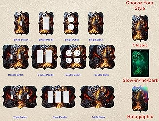 - All designs are available in 3 custom finishes. Classic: Features a durable non-reflective smooth sheen. Holographic: This reflective metallic effect captures all of the colors of a rainbow. Glow-in-the-Dark: Watch your wall plate come alive when the lights go down. Adds a great twist to any design. Quickly and easily customize any room in your house. Replace your old light switch, electrical outlet, and wall covers with our collection of handcrafted wall plates. All OFF THE WALL PLATES are made in the USA! OFF THE WALL PLATES are available for standard switches, outlets and paddle designs as well as blank covers in single, double and triple gang styles (# of switch/outlet slots). Each cover is made of 1/8 inch laser cut acrylic and features an exclusive 3mm soft foam base that sits flush on the wall to help protect against scratches or damage. OFF THE WALL PLATES are easy to clean and are designed for long-term durability that will stand the test of time. Please see the images for the exact dimensions of each unique cover. Each Package includes (1) OFF THE WALL PLATE of your choice, mounting screws & matching screw cap cover stickers that complement the design.
