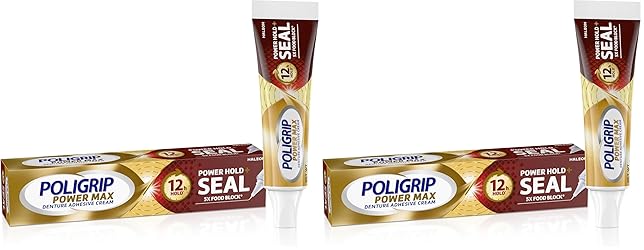 - Poligrip Power Max Power Hold + Seal Denture Adhesive Cream gives your dentures the strongest all day hold with 5x the protective food seal (1, 2). Even well-fitting dentures are susceptible to food particles that can cause discomfort and gum irritation. This Poligrip denture adhesive cream is x16 clinically proven and delivers the strongest hold (2) and features a precision nozzle that enables the denture cream to deliver an all around seal to help keep food from getting stuck under your dentures. This denture adhesive is formulated to be flavor free. The smaller tube size is perfect for tucking in your travel bag or purse for on-the-go denture products. Just apply a small amount of dental adhesive to clean, dry, well-fitting dentures once daily as part of your dental care routine for 12 hour hold. Poligrip Power Max dental adhesive creates a layer between your dentures and gums for a comfortable fit and strong, all day hold, allowing you to eat, speak and smile with confidence. (1) versus no adhesive (2) within Poligrip range