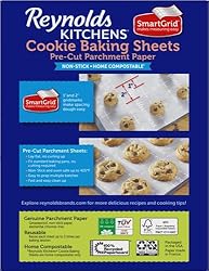 - Whether you're baking cookies or preparing everyday meals in the oven, Reynolds Kitchens Cookie Baking Sheets let you focus on the joy of cooking. These pre-cut 12 x 16 inch pieces of Reynolds parchment paper are non-stick, so your food slides right off the baking sheet without breaking or crumbling. These baking parchment sheets come pre-cut to the size of a standard cookie sheet, and lay flat without curling or rolling, so you don't waste parchment or time cutting it to size. Save even more time with the SmartGrid lines, which measure 1- and 2-inch squares to help space out your dough. Each sheet of oven paper is oven safe up to 425 degrees Fahrenheit, and can be used up to three times per cookie baking session. Have fun baking and get better results, time after time, with these pre-cut parchment sheets.