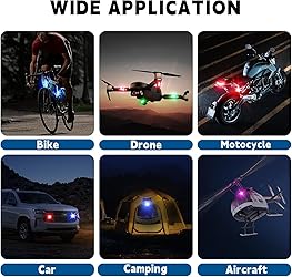 🚕【8 Colors & Multi-Modes】 The strobe led lights has white, red, green, blue, yellow, Purple, pink, ice blue 8 colors, and several modes: static mode, fast flashing, slow flashing, 8 color cycle, civil activation mode, memory function, 🚕【Upgraded Remote Control】2 PcsThe anti-collision lights comes with a remote controller, the light colors / modes can be switched more easily, more convenient to use in your car, bike, motorcycle, scooter. 🚕【Large capacity battery】 Long battery life, fast mode can be used for 6 hours, large capacity battery, 5V 1A, fully charged in 15 minutes,The actual time may differ for different modes working. 🚕【Smaller Size & Brighter Lights】Only weights 7.5g/pc, this led mini strobe lights won't causes extra burden & takes the space. The battery powered strobe light adopts premium led chip-set, light effects & brightness will be better. 🚕【Wide Applications】This wireless motorcycle lights not only suitable for Drone DJI Air 2S / Mini 2 / Mavic Air 2 / Mavic Mini / Mavic Pro / FPV / Holy Stone, but for cars, RC car, RC boat, E-bike, dirt bike, motorcycle, scooter, paramotor, camping, fishing, hiking, truck emergency and etc. 🚕【Note】 When you receive the package of rechargeable flashing lights please charge them before first use. The red indicator light will ON when charging, if OFF means fully charged.