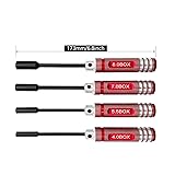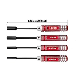 RC TOOLBOX MUST HAVE - Four hex nut drivers with socket sizes of 4mm, 5.5mm, 7mm, 8mm. A RC tool set functions excellently for low torque applications. STURDY: Quality metal gives the nut driver set extraordinary hardness. Advanced workmanship makes sturdy and durable nut drivers. COST-EFFECTIVE: One purchase brings you four nut drivers, respectively 4mm nut driver for M2 nuts, 5.5mm nut driver for M3 nuts, 7mm nut driver for M4 nuts, and 8mm nut driver for M5 nuts. NON-SLIP: More than making a good-looking nut driver, great metal knurling on handle enables better grip. VERSATILE: These thin-walled nut drivers are applicable to assemble/disassemble RC vehicle/helicopters, FPV equipments, electronic components, and household appliances.