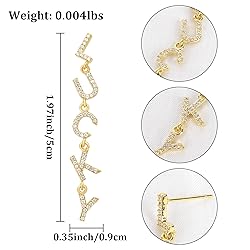 - This gold Lucky letter dangle earring boasts a unique design and exquisite craftsmanship, adding a touch of luxury to your ears. Each letter is connected by a circular ring, hanging vertically, with dazzling cubic zirconia stones embedded on each letter, emitting a charming radiance. Whether it's day or night, this earring will be the highlight of your fashionable look. Whether it's for daily wear, work, or evening parties, this gold Lucky dangle earring will add elegance and charm to your look. Its simple and generous design style suits various types of women, whether sweet and fresh or mature and intellectual, effortlessly complementing any outfit. Whether you're in leisure or formal settings, this dangle lucky earring is your perfect accessory, showcasing your unique charm. Whether it's New Year, birthday, Valentine's Day, or Mother's Day, this elegant gold dangle Lucky letter earring is the perfect gift choice. It symbolizes luck and beauty while conveying blessings and care. Presenting this gold lucky letter earring to your loved ones, friends, or partners will surely add warmth and joy to the festival.