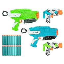- AIR WARRIORS: BLITZ FIRE SET - 4 PACK DART BLASTER SET - The ultimate dart-blasting combo is here—the Air Warriors Blitz Fire Set, where power meets precision for an unmatched dart-blasting adventure! This dynamic duo includes two Blitz 6 blasters and two Tek 3 blasters, ensuring you're fully equipped for intense battles. Prepare to dominate the dart-blasting arena with the Blitz 6 blasters. Each blaster redefines the playing field, propelling your darts farther than ever before. The Blitz 6 boasts a 6-chamber auto-advancing blaster, allowing you to maintain an unyielding barrage of darts against your opponents. Whether you're a seasoned pro or new to the dart-blasting scene, the Blitz 6 is engineered for ease of use. Load your darts, pull back on the ring, release, and with a pull of the trigger, watch your darts soar through the air. Safety and durability are paramount, as the Air Warriors Blitz Fire Set undergoes rigorous testing to withstand the demands of intense play. Perfect for children aged 8 and older, this set makes an exciting gift for birthdays, pool parties, and other celebrations. But that's not all—enter the Buzz Bee Toys Air Warriors Tek 3 Twin Pack, offering double trouble for your adversaries. Compact-sized with a carrying clip attached, the Tek 3 blasters are always at your side. Just pull back on the clip, then pull the trigger to hit your target. The manually rotating barrel ensures you're ready for the next dart launch. Recommended for children 6 years of age and older, each Tek 3 blaster includes 3 suction darts for precision strikes. The Air Warriors Blitz Fire Set is the ultimate arsenal for dart-blasting champions. With the Blitz 6's power and the Tek 3's versatility, you'll experience a thrilling adventure where every shot counts. Join the ranks of dart-blasting champions and gear up for hours of action-packed fun!