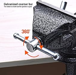 Versatile 360-degree swivel base with an integrated anvil allows for effortless positioning of workpieces at any angle, enhancing productivity and precision Crafted from heavy-duty cast iron steel, ensuring unparalleled durability and stability for even the toughest tasks in woodworking, pipefitting, and metalworking Secure grip clamp-on vise features hardened jaws that provide a firm hold on materials, guaranteeing safety and efficiency throughout your projects Adjustable jaw width accommodates a variety of workpieces, offering flexibility and convenience for a wide range of applications Easy installation process means you can set up your workspace quickly and efficiently, getting you to work faster with minimal hassle