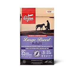 - Help your large breed dog thrive with a Biologically Appropriate diet packed with whole animal ingredients. Our ORIJEN™ Large Breed Adult diet is tailored to the unique needs of large breed dogs, and it helps support key health benefits including Joint Health, Skin and Coat Health and Digestive Health. ORIJEN Large Breed Adult dry dog food is crafted with 85%* quality animal ingredients like free-run** chicken and turkey and wild-caught fish to nourish your large breed dog. Packed with WholePrey animal ingredients like organs, this high-protein dry dog food is made with the most nutrient-dense, succulent parts of the prey to deliver the nutrition dogs need. The result is a high-protein diet for your canine companion that is beyond comparison. *Approximate and derived from the unprocessed state of the ingredients. **Our free-run chickens and turkeys are not housed in cages and are able to move in a barn without outdoor access. Our fresh ingredients use refrigeration as the sole method of preservation and our raw ingredients are frozen at their peak freshness.