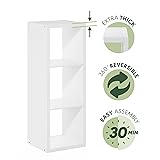 SLEEK & FUNCTIONAL DESIGN: This book shelf features a clean-lined, thick frame structure that complements modern or transitional interiors, perfect for living rooms, bedrooms, or home offices 3-CUBE OPEN DISPLAY: This reversible bookshelf provides three vertical spacious open back cube compartments makes it ideal for storing books, baskets, collectibles, or decorative items, keeping your space tidy and visually balanced WEIGHT CAPACITY: Each shelf of this 4-cube bookcase holds up to 30 lbs each and top panel holds 55 lbs; Total holds 145 lbs STURDY BUILT: Crafted from high-quality, durable composite wood that easily be assemble with provided instruction. Built with FSC-certified wood, it unites sustainable materials and refined craftsmanship to deliver long-term durability and reliable use DIMENSION: 14.6(D) x 15.9(W) x 44.0(H) inch