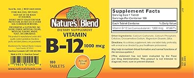 - Nature's Blend Vitamin B-12 1000 MCG, 100 Tablets - Boosts Energy, Supports Nerve Health, Enhances Metabolism, and Promotes Red Blood Cell Formation. Each bottle contains 100 Vitamin B-12 1,000mcg tablets. This product is made without sugar, gluten, starch, wheat, yeast, preservatives, and artificial colors or flavors. Nature’s Blend products are manufactured in America from internationally sourced ingredients. Directions for Use: Take one tablet per day, preferably with or after a meal, or as instructed by your trusted healthcare provider. Please review the label, ingredients, allergens, and other product information before purchase to ensure that this dietary supplement is suitable for you.