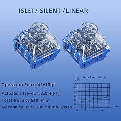 [Quality] Kailh Box Islet Pro Linear switches feature rounded dust walls, cross guides,and a clear pc top cover for better light transmission,pre lubed switches,Provides a smoother and lighter typing experience,Up to 100 million cycles of service life [Featured] Kailh Unique box structure (dustproof and waterproof), the switch adopts a new material mute pad, very low noise, better mute effect, Silent linear switches are suitable for offices, libraries and other applications where noise reduction is required. [Compatibility] 3 pin switch, Compatible with Most hot-swappable mechanical gaming keyboards or custom keyboards. [Product Parameters] Operation Force:45±10gf | Pre travel:1.8±0.4(mm) | Total Travel:3.6±0.4mm | Spring:20mm | Mechanical life: 100 Million Cycles | [Packaging] Using delicate and beautiful plastic tray, each switch is placed individually to prevent the pins from bending.