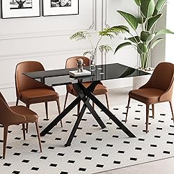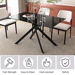 - 【Decsription】 Binrrio 51" Rectangular Glass Dining Table Modern Kitchen Glass Top Table for 4 with Black Metal Legs, Black Glass Dining Table Kitchen Glass Table for Home Office Kitchen Dining Room 【Features】 1. Product Dimension: W51.18"*D29.53"*H29.92",Net weight:52.8lbs,Weight capacity:180lbs 2. Premium Quality Materials: 8mm thickness of the tempered glass top not only adds an elegant touch but also provides superior strength, making it resistant to scratches and breakage.Silver Chrome Plated Metal Legs undergo a special treatment that results in a robust silver layer, offering increased durability and corrosion resistance.They are not only visually appealing but also sturdy, providing excellent support for the table. 3. Stylish and Unique Design: The dining table features a sleek and contemporary design. The combination of tempered glass and unique legs creates a striking visual contrast, adding a touch of sophistication to your home decor. Its unique shape and design make it a focal point in dining room, making a statement of style and taste.The anti-slip mats ensure that the table stays put and doesn't scratch your floor. 4. Versatile Functionality: This dining table offers versatile functionality, accommodating various needs and preferences. 5. Easy Maintenance and Cleaning: The glass surface is easy to clean, requiring only a quick wipe with a damp cloth to remove dust or spills.The silver-plated legs are resistant to tarnishing, ensuring long-lasting shine with minimal effort. 6. Easy To Assemble: All hardwares and accessories are provided. It comes with easy-to-follow instructions.