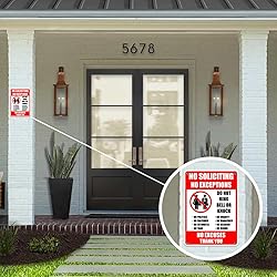 Proudly American-Made: By choosing this signage, you support local American manufacturing and celebrate the skill and craftsmanship of American artisans. Don't be fooled by imitations. Buy from a true American company, Factory Crafts. Weather Resistant: PVC is renowned for its resistance to enviromental elements. Unlike aluminum, pvc won't corrode, rust, or degrade under sun exposure or in wet conditions, ensuring your sign remains impactful and intact for years to come. Impact Resistance: Our PVC signs are highly resilient against impacts and scratches, making them a robust choice for both urban and rural settings where they might be subject to more wear and tear. Flexibility and Safety: Lightweight and yet sturdy, PVC reduces the risk of injury due to shap edges, a common issue with metal signs. Its flexibility makes it less likely to bend or break if impacted, maintaining its appearance and readability. Vibrant Visibility: Featuring a bright red and white color scheme with bold, fade-resistant lettering, our signs ensure maximum visibility from a distance, making sure your message is clear and obeyed. Ease of Installation: Equipped with pre-drilled holes, our PVC signs are simple to mount on various surfaces. Whether you are attaching it to a fence, gate or wall, installation is quick and hassle-free. Screws, wire ties, nails, and double sided adhesive can all be used to hang our sign with ease. Sign: No soliciting no exceptions (Single)