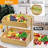 - Organize and access your produce with ease using our fruit basket for kitchen. This 2-tier fruit holder provides ample space for all your fruits and vegetables, making it the perfect produce storage solution for your countertop. With the capacity to hold over a dozen fruits and vegetables on each level, healthy cooking is a breeze.Our fruit basket has been designed with a spacious and open structure, allowing for optimal air circulation and ventilation to keep your fruits fresh and ripe for longer.Not just a functional storage solution, this fruit and vegetable storage is also an elegant decorative piece that can be displayed on your kitchen island or dining table. It's perfect for adding a pop of natural beauty to any room in your home.The simple and stylish appearance and ample storage space are suitable no matter where it is placed. It can be a fruit stand, vegetable storage for kitchen, bread basket, spice rack on the countertop, or a snack storage rack in the bedroom.WARM TIPS:- Please follow our installation instructions steps to assemble the bamboo Fruit Basket.- Please try to use hand screwdriver, if you use electric screwcriver, please control the strength and frequency to avoid cracking the bamboo screw hole.- About clean: please wipe it with dry cloth, keep it dry and ventilated, please don't directly use water to clean it which will make it deformation.