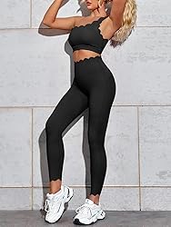 【What Material We Use】: Crafted from a fusion of high-quality, performance-driven fabrics, this women's 2-piece workout set is designed to elevate your gym experience. Both the leggings and the sports bra feature a lightweight, four-way stretch material that conforms to your body's contours for a flattering, second-skin fit. 【Sets Chic Design】: This stylish workout ensemble showcases several distinctive features that seamlessly blend fashion and function. The high-waisted leggings feature a scollop design, adding a touch of feminine elegance to your activewear. One-shoulder sports bra exhibits a trendy asymmetrical design, offering a modern twist on traditional athletic wear. Ensuring your every move is unhindered, whether you're doing fitness or practicing yoga. 【Suitable For Most Occasion】: This versatile workout set is ideal for various fitness activities and environments. It is perfectly suited for gym sessions, outdoor workouts, the breathable fabric make it a great choice for jogging, cycling, or hiking. Moreover, the chic design transcends the gym, allowing you to transition seamlessly into other athleisure settings like running errands, casual coffee dates, or even attending virtual fitness classes from the comfort of your home. 【Versatile Ootd Tips】: For a cohesive and fashionable gym look, pair these leggings and sports bra together as intended. Layer a cropped tank or mesh long sleeve top over the sports bra for added coverage during cooler weather or for a more modest appearance. Finish off the ensemble with a pair of matching or complementary trainers, a functional gym bag, and a moisture-wicking headband to keep stray hairs at bay. 【Fisoew Notes for You】: See details in product rich description, add this sets to your wishlist, we will update new color at any time. Machine wash your tracksuits in cold water on a gentle cycle. This helps to preserve the color and prevent shrinkage. Avoid using bleach or harsh detergents as they can damage the fabric.