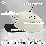 VINTAGE CHARM: Cute baseball caps for women are a perfect blend of vintage charm and modern comfort, with their two-tone retro design. These funny hats for women, made from a 50% cotton and 50% polyester blend, offer a soft, comfortable fit that's both durable and breathable. ADJUSTABLE FIT: Trucker hat women will love for its comfort and style, designed to fit both genders with an adjustable snap back closure for a consistent fit. This womens trucker hat maintains its shape with a structured fit and a curved brim, ensuring a comfortable fit with an inner circumference of 22 inches, a crown height of 3.5 inches, and a brim length of 2.5 inches. COLOR VARIETY: Vintage trucker hat lovers will appreciate these tan trucker hats, skillfully merging vintage charm with modern fashion in a two-tone beige palette. Funny trucker hats for women come in a range of colors like army green, black, and maroon, offering a timeless aesthetic and detailed embroidery for depth and versatility. VERSATILE WEAR: Perfect for casual daily wear or outdoor activities, these trucker hats offer versatility with their breathable polyester and cotton construction. Secure snapback fit makes them a comfortable choice for any activity, adding a stylish edge to your outfit whether you're at a music festival or in a casual work environment. GIFTABLE: Gift these trucker hats and make someone's day with their blend of style, functionality, and versatility. The vintage-inspired design appeals to those who appreciate a retro yet trendy aesthetic, while the adjustable snapback ensures a comfortable fit for all head sizes and the detailed embroidery adds a touch of luxury.