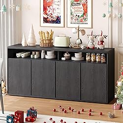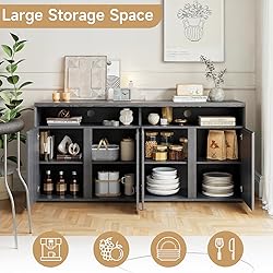 Exquisite Design: The kitchen sideboard features a black exterior and beveled door design, adding a unique sense of fashion and charm to the product. The cable hole and soft closing hinge enhance the user experience, while the wall connection fixer device give family peace of mind Large Storage Space: This buffet cabinet offers ample storage, with a spacious 63-inch countertop for coffee machines, microwaves, and vases. On top, open shelves are handy for books and cups. Additionally, four compartments organize larger items like cutlery and dry goods, fulfilling all your storage needs Versatile for Multiple Uses: This sideboard cabinet boasts a beautiful appearance and diverse functionalities. Whether it is used as an entryway cabinet, kitchen buffet cabinet, living room TV cabinet, or coffee bar cabinet, it can handle them all with ease, adding a touch of elegance and uniqueness to your daily life Sturdy & Stable: The buffet storage sideboard is made from engineered wood and MDF, ensuring stability and durability. It can hold up to 210 pounds on the countertop and 50 pounds on the internal shelves, providing ample support for your daily usage needs Easy Assembly: The console table has all the necessary hardware, labeled parts, and clear instructions that will assist you in easily assembling this kitchen storage cabinet. The assembly process takes 40mins. For any questions about it, you will enjoy attentive 24/7 customer service