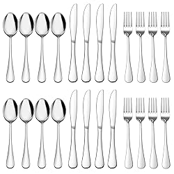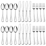 24 PIECES SILVERWARE SET FOR 8: Total 24 pieces in a set, Contains 8 for each: 8 inch dinner forks, 8 inch dinner spoons and 9 inch dinner knives, Can meet most of your dining needs in daily life, Can be used for eating spaghetti, thick soup, oatmeal, steak, chicken and etc., Perfect to replace your existing eating utensils, Ideal for home dinner, kitchen, restaurant and hotel HIGH QUALITY METAL FLATWARE: Made of food-grade 18/0 stainless steel without harmful substances and nickel free, Healthy for everyday use, Rust and corrosion resistance will be durable for longer term service, Solid and premium metal sturdy enough and not easy to bend and break, Good choice for your family EASY TO CLEAN & DISHWASHER SAFE: Without extra pattern on handle, stain and dirty have nowhere to hide, Dishwasher safe can free your hands, Save your time and labor with less hassle, make cleaning a breeze, Smooth mirror finish surface for easy cleaning, Can remove the residue easily even by hand washing SIMPLE & ELEGANT LOOK: Simple and sleek design without extra pattern, Classic shape and smooth edges handle, Creates an elegant look to match with various styles of existing utensil and table decoration, Perfect for different occasions: dinner, gathering, wedding, BBQ, party, birthday or any other dining activities COMFORTABLE HOLDING: The silver dinner forks, spoons and knives set have ergonomically-designed and round handle, make it feel good in hands, Appropriate weight and suitable size, ensure well balance, Smooth surface with no sharp edge provide maximum comfort and secure gripping