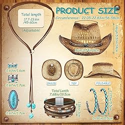 Trusted Material: our western jewelry for women is made of quality alloy, turquoise and faux leather, friendly to your skin, solid and lightweight, sturdy and not easy to break, deform or fade, can be applied for a long time, will not bring much burden to you Turquoise Design: this turquoise jewelry set features exquisite workmanship, is designed with turquoise and classic colors, elegant and full of western atmosphere, making you look more stylish Package Includes: the package will come with 1 set of turquoise jewelry for women, including 1 cowboy hat, 1 bohemian layered bracelet, 1 pair of turquoise dangle earrings, 1 turquoise pendant necklace and 3 turquoise finger rings, good collocation to meet your wearing, matching and replacement needs Size Information: this turquoise necklace is long enough for you to wear, you can adjust the length as you need, and these turquoise earrings, rings and bracelets are all in one size, suitable for most women, offering you a comfortable wearing experience Great Gifts: these turquoise rings, bracelet, earrings and necklace can be sent as considerate and pragmatic presents to your family members, wife on their birthday, anniversaries, festivals, halloween cosplay party and other special days, conveying your love, care and kindness to them