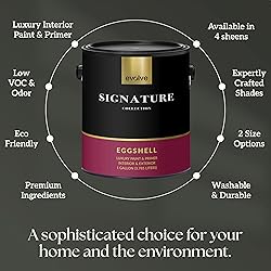 PAINT + PRIMER IN ONE: Signature formula delivers flawless coverage from the first stroke, sealing surfaces and minimizing coats for a refined finish. DESIGNER-CURATED PALETTE & VERSATILE FINISHES: Elevate your space with our collection of rich, high-pigment colors meticulously selected for a luxury finish. Available in all four professional sheens and both 1-Gallon and 5-Gallon sizes to perfectly suit any project from accent walls to full-home renovations. EXCEPTIONAL HIDE & COVERAGE: Smoothly conceals old colors and imperfections, leaving walls impeccably even and effortlessly elegant. EGGSHELL SHEEN – SOFT & VELVETY: A refined, low-sheen finish that balances elegance with everyday durability. This washable wall paint is perfect for dining rooms and hallways, offering a subtle glow that resists fading while remaining easy to clean. DURABLE & WASHABLE FINISH: Our stain and scrub-resistant formula ensures fingerprints, smudges, and scuffs wipe away easily without dulling. Keep your walls looking polished and fresh with a finish built to withstand the rigors of real-life use. SELF-LEVELING & LOW-ODOR FORMULA: Achieve a professional, streak-free finish with our advanced self leveling technology that smooths out brush and roller marks. Our eco-friendly, Low-VOC formula ensures a low-odor experience, making it safe and pleasant to transform your interior spaces without harsh fumes. USA-MADE, ECO-FRIENDLY PAINT: Crafted in the USA with sustainable, low-waste processes for long lasting, high-end color you can trust.