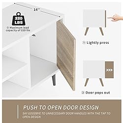 【Convenient Push-to-Open Cabinets】Features two spacious cabinets with an easy push-to-open mechanism (ejector + magnetic catch). Simply press the door to open the entertainment center effortlessly, and it securely seals upon closing – no handles needed 【Modern Design & Generous Size】This stylish Mid-Century Modern TV stand accommodates TVs up to 55-65 inches (Overall Dimensions: 58"W x 14"D x 19"H). Elevate your living room, bedroom, office, or lounge with its sleek silhouette 【Sturdy Build & Easy Care】Supported by 5 robust legs (featuring protective floor pads) and crafted from high-quality wood, this tv stand for livingroom offers lasting durability and ample under-cabinet clearance for cleaning. Maintain its pristine look easily with a quick wipe using a dry or damp cloth 【Cable Management】Holes on the back allow cables from various devices to pass through. This TV stand is stable and Sturdy , and the legs have feet to avoid scratching the floor 【Hassle-Free Assembly】Get set up in no time! Includes numbered parts, a detailed manual, all necessary tools, and helpful video instructions for a quick and simple assembly process