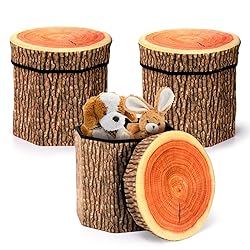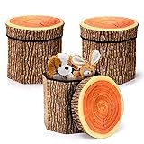 Lawei 3 Pack Tree Stump Storage Stools, 12 x 12 Inches Folding Stool Ottoman with Foam Cushion, Collapsible Storages Seat Chest, Vintage Storage Toy Box Wood Stump Organizer Stools for Toy