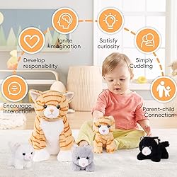 - Features: The cat stuffed animal toys contain 1 mommy cat and 4 cute kitten babies plushie. They can provide fun and a bit of learning for children. The soft cat body just invites hugging, making her an attractive toy for children of all ages. Notes: Manual measurement, please allow slight errors on size. The color may exist a slight difference due to different screen displays.