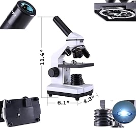 Versatile: Microscope includes 10X and 25X eyepieces, a 2X magnifying lens, and 4X, 10X, and 40X rotating objective lenses, offering a magnification level up to 2000X, suitable for students and adults for various scientific research purposes High-Quality: Microscope equipped with an exceptional optical system and upgraded achromatic objectives, ensuring clear and sharp images Focusing: Microscope features a hand wheel for simple focusing adjustments, user-friendly for all ages LED Illumination: Microscope provides both top and bottom LED illumination with adjustable brightness Convenience: Microscope offers a 45° observation angle and 360° rotation for flexible viewing angles Combo Set: Microscope comes with complete accessories including slides and instructions, ready to experiment upon arrival