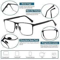 ✨High-Quality Materials: This progressive reading glasses is made of a solid metal frame and high-definition resin lenses, which restores 100% of the colors without image distortion; soft silicone nose pads and anti-slip temples design, Light and comfortable, there is almost no pressure on the nose and ears when worn, and it is suitable for all face shapes. ✨Product Features: Progressive multifocal reading glasses for women With UV400 anti-blue light protection function, it can effectively resist ultraviolet rays and harmful blue light; transition reading glasses Reduce glare and always maintain clear vision; thus improving the use of electronic devices in our daily life It provides instant comfort and visual quality, allowing you to stay in good shape even in your busy digital life. ✨Unique Design: Progressive readers for men Multi-focus gradient design lenses, the bottom design has the degree of your choice, you can easily cope with it whether you are reading a book or viewing a menu; the transition design in the middle is suitable for working in front of the computer; the top part is suitable for working in front of the computer It is clear without any amplification function and is suitable for communicating with people in daily life or appreciating distant scenery. ✨Wide Application: Whether it is outdoor fishing, hiking, or indoor reading, playing chess and other activities, blue light glasses men can meet your needs. It is very suitable for wearing when watching TV, using mobile phones, Ipads or computers, and prevents Blue light and multi-focus gradient functions make your eyes comfortable after using digital products for a long time. ✨Package Contents: You will get an exquisite and convenient set, progressive reading glasses men × 1, microfiber cleaning cloth × 1, anti-deformation glasses case × 1. Whether for work or leisure, these glasses are your ideal choice. Give progressive readers as a gift to your family or friends, so that your love can accompany them at any time.