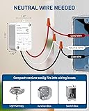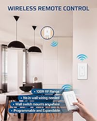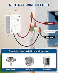 【No in-Wall Wiring Required】Simply install the DEWENWILS receiver between the power and lighting fixtures (neutral wire needed), you can switch your lights on and off from anywhere via the remote control panel. Expand your lighting system freely and won't affect the existing system. Easy installation, saving large scale of labors and material costs comparing to traditional switches, neutral wire required 【Long Distance Remote Control】 The remote control light switch kit has strong RF signal, it works through walls and doors without any interference; does not require line of sight while using; up to 100ft range in open areas. This remote switch can remotely control any light in your home at the push of a button 【Programmable and Expandable】This remote light switch kit can be programmable and expanded at will, enabling one switch to control multiple receivers at the same time or multiple switches to control one receiver at the same time (Same Model Only). Dewenwils transmitter wall switch and receiver have been pre-programmed for immediate use 【Detachable ON/OFF Wall Switch and Compact Receiver Kit】Mounting bracket provided; white RF remote control wall mountable switch mounts anywhere; compact receiver switch kit fits limited space like rose/canopy, electrical junction box, switch box. The detachable switch can providing you greater flexibility and convenience 【Widely Used with Multiple Appliances】1 Switch controls a group of lights (1000W tungsten / 600W fluorescent / 200W LED); remotely turn on/off indoor lighting fixtures, ceiling lights, plug-in pendant, lamps, hard-to-reach lights, and other electric appliances with a push of a wall switch. It is very convenient for the elderly with limited mobility, pregnant women, and the disabled