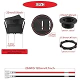 SPECIFICATIONS:Rated Voltage And Current:6A/250V AC; 10A/125V AC;Positions: 2 (ON/OFF);Pin Quantity: 2;Contact Type: SPST;Mounting Type:Panel Mount;Round Rocker Switch Shell: 29mm/1.13inch;Mounting Hole Diameter: 20mm/0.79inch;Cable Length: 120mm / 4.7inch;Wire Gauge:20AWG;Material: Plastic,Metal;Color: Black. SNAP-IN INSTALLATION:This 12 Volt toggle switch is snap-in design, which makes the installation of this small switch become much easier and quicker. EASY TO USE:The mounting hole size of the round rocker switch shell is 29mm (about 1.13 inch), if you remove the shell, the mounting hole size will be 20mm (about 0.79 inch). Insert the switch into the hole, and connect the wire. The installation is simple. With keyhole slot, which can be inserted firmly ensure stable working performance. WIDE APPLICATIONS:Due to the capacity of the ON/OFF switch, it will be suitable for automotive, car, truck, boat,rv, yacht, DIY projects, household appliances, etc. PACKAGE CONTECT:4 x ON OFF Round Rocker Switch 12V;4 x Round Shell;12 x Terminal Wires.