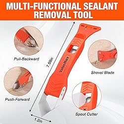 Innovative Construction: The caulk gun features a 360-degree rotatable barrel, allowing for seamless maneuverability in tight spaces. Its built-in spout cutter serves as a handy utility knife for quick nozzle adjustments. A seal puncture pin ensures controlled adhesive flow. The metal rod is equipped with a gear mechanism that enhances grip and force, preventing slippage during use, providing a 10:1 thrust ratio for smoother, more powerful application. Effortless Use: This caulk gun is designed for simplicity; the metal lever unlocks for easy forward and backward movement. When locked, it allows for precise application of various materials, ensuring a mess-free experience with medium to high viscosity adhesives. You can count on it for clean results without any drips. Compact and Handy: Weighing only 0.95 lbs and measuring 11.35 inches x 6.7 inches, this caulk gun is lightweight and easy to handle. Its sturdy silver metal handle doubles as a convenient hook, allowing you to hang it on a ladder or in your workshop for quick access during projects. Comprehensive Kit: The ValueMax Caulk Gun Kit includes a caulk gun and 5PCS specialized caulking removal tools, designed to work in tandem. Use the caulk gun for precise sealing, while the removal tools effortlessly tackle stubborn old adhesive, ensuring smooth and clean sealing lines. This complete set is your ultimate companion for all caulking projects. Versatile Applications: This 10 oz caulk gun is suitable for various sealing tasks, including windowsills, brick joints, toilet seals, and sink edges. Its adaptability makes it an essential tool for both DIY enthusiasts and professionals, helping to create watertight seals in different environments.